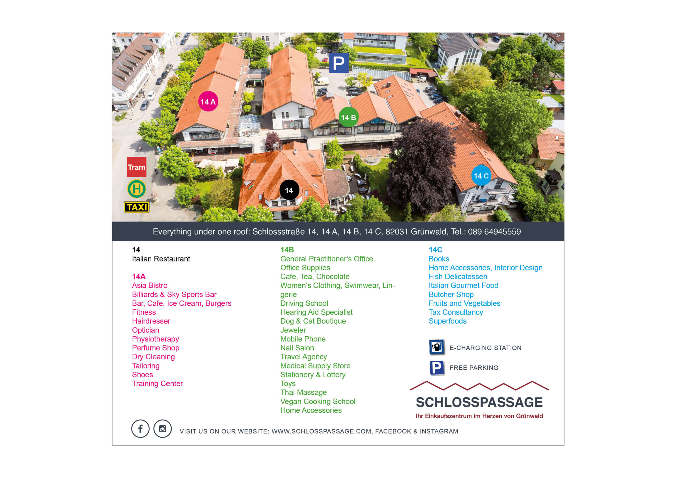 Around 40 stores and service providers, 50 dedicated parking spaces and an enormous range of goods and services await visitors to SCHLOSSPASSAGE, the modern shopping center right in the center of Grünwald. With a single parking stop, numerous purchases can be made and services used - and after a comfortable stroll through the stores, relaxation and culinary refreshments are also provided.