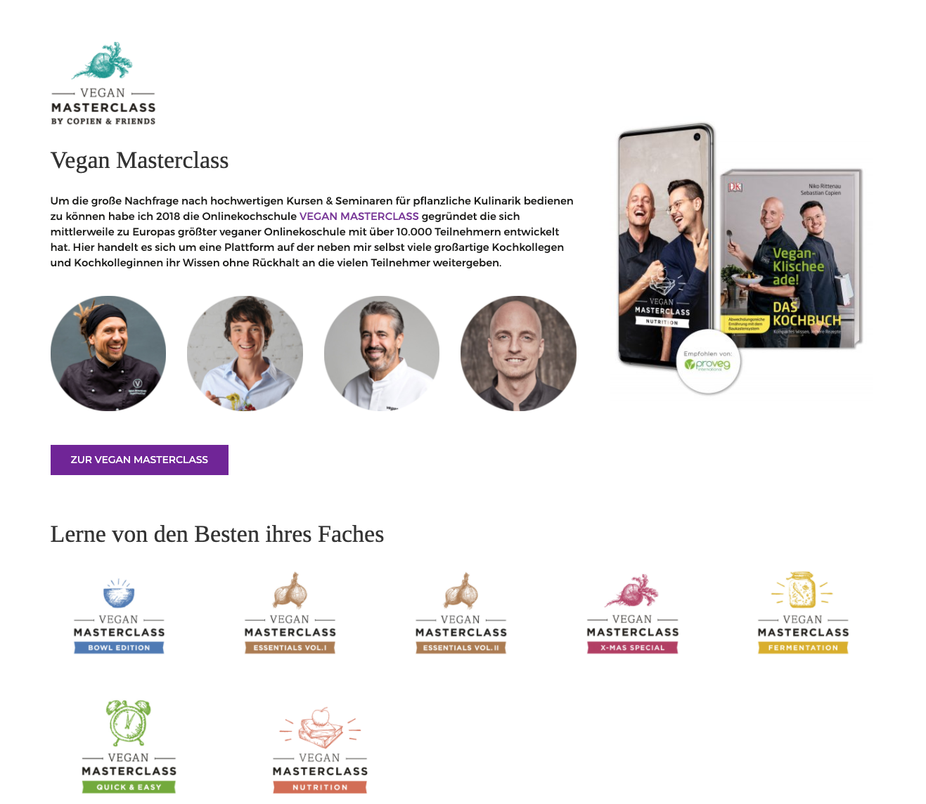 Sei es in seiner Grünwalder Küche, als Gründer und Dozent im Plant-Based-Institute oder in seiner Onlinekochschule VEGAN MASTERCLASS: bei Sebastian Copien dreht sich alles darum, die Schlüsselfaktoren herausragender veganer Küche in den Alltag von Gastronomie und Privathaushalten nachhaltig zu integrieren – für eine Welt mit genussvollem und gesundem Essen, das gut für alle Lebewesen und unsere Umwelt ist. Er hält dazu in seiner Grünwalder Koch-Location und europaweit Seminare, Showkochevents sowie Kochkurse, berät Hotels und Restaurants zu einer vielfältigen pflanzlichen Küche und veranstaltet regelmäßig Fine-Dining-Dinnerabende.